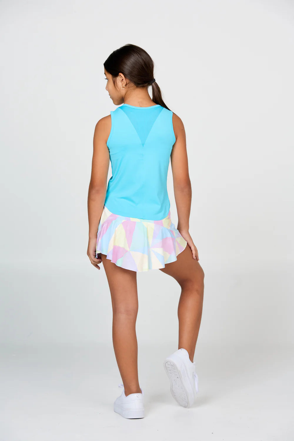 For this girls' tennis tank top simplicity is key. The most flattering fit is combined with high-performance fabrics. You will love this contemporary girls' tennis tank top with mesh V insert in the back for extra ventilation while playing. This style is so easy to match with a multitude of bottoms in this collection as well as with staple pieces. Features all the important issues we need to address with our performance attire: UV protection, moisture wicking, quick drying, four way stretch, and pilling resistance.