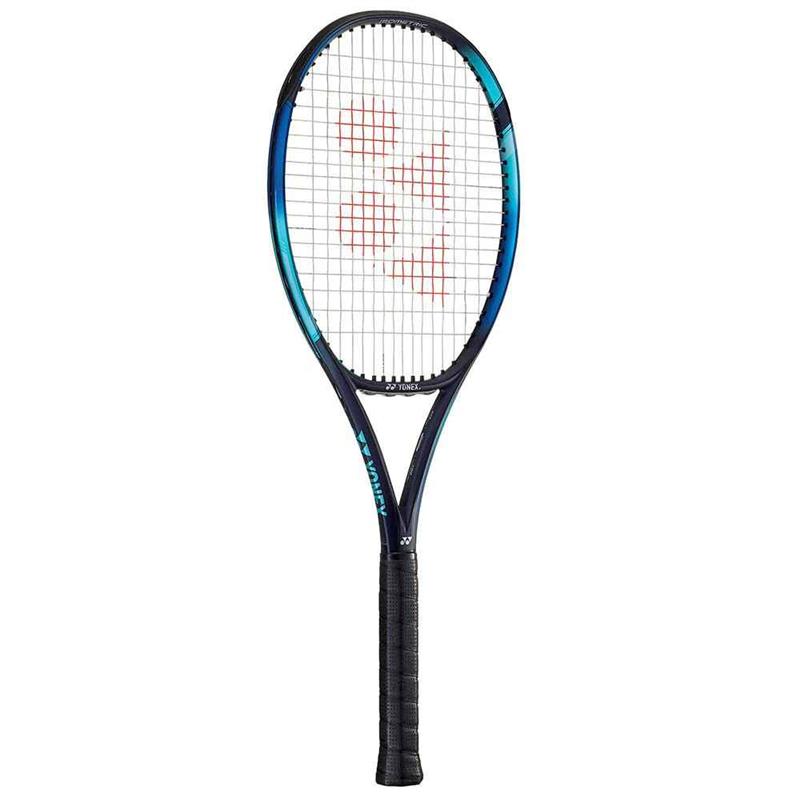Yonex EZONE 98 (7th Gen.) continues to deliver power and fast racquet head speed. The Yonex EZONE 98 tennis racquet plays with an excellent feel thanks to the new shaft design that promotes improved stability and power. The new shaft design has a thicker shaft structure with a convex design to reduce racquet torque on off-centered shots. The new design and improved stability add to the Yonex EZONE 98's impressive power. The Aero Shaped Design of the racquet provides a plush feel thanks to its tapered design with a thinner frame face creating a softer feeling racquet despite the racquet's flex in the mid 60's. As players play through shot impact Yonex's Oval Pressed Shaft flexes at impact for increased ball dwell time on the string bed. The Yonex EZONE 98 has a frame layup made of High Modulus Graphite, 2G-NAMD Speed, and Vibration Dampening Mesh (VDM). The H.M. Graphite and 2G-NAMD Speed graphite provide enhanced feel and response for players while also improving overall speed. VDM, a stretchy mesh material wrapped around the racquet handle's inner graphite, filters unwanted vibrations making the Yonex EZONE 98 one of the brand's most comfortable racquets to date. Dialed in and perfectly suited for intermediate to advanced players, the Yonex EZONE 98 tennis racquet features a very maneuverable strung weight thanks to its headlight balance while the signature Yonex Isometric head shape increases the string bed's sweet spot. Players looking to unleash powerful groundstrokes and booming serves can play with plenty of confidence with this generation of the Yonex EZONE 98. Stable at net thanks to its flex rating and shaft design, this racquet can stand up to heavy hitters and redirect power without sacrificing comfort in your hand and arm making the Yonex EZONE 98 tennis racquet far beyond ordinary
